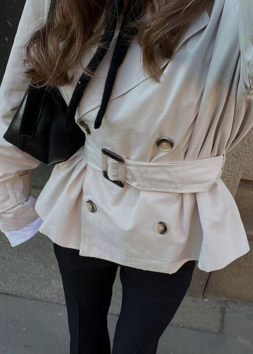 A cropped, waist-cinching trench with a structured high collar, double-breasted front and clean lines. The tailored silhouette delivers instant polish and effortless layering.