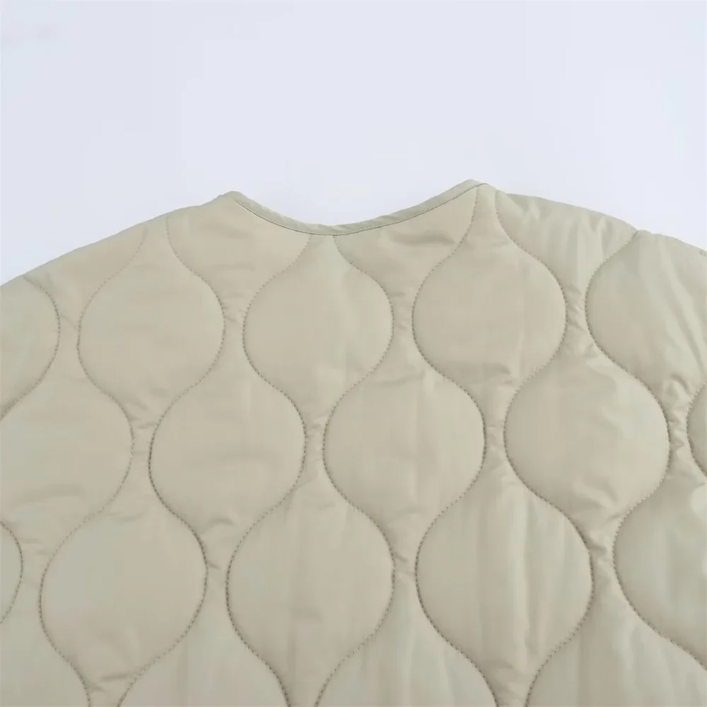 An oversized quilted jacket in soft beige with wave stitching, rounded neckline and a clean front zip, finished with two roomy patch pockets. The relaxed cut drapes effortlessly for easy layering.